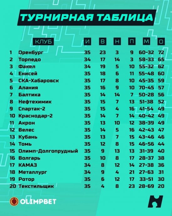 Также не избежал очередной смены тренера "Олимп-Долгопрудный" - Александр Точилин покинул пост рулевого, а старшим тренером стал Денис Евсиков. Подмосковной команде этот шаг позволил прервать серию из трех матчей без побед и голов, хотя "Томь" в первом тайме откровенно доминировала. Во второй половине всё было не так однозначно, а судьбу встречи, как это часто бывает, решил единственный гол - вышедший на замену воспитанник академии "Динамо" Караев забил свой первый мяч в ФНЛ, замкнув прострел Коваленко. 1:0 - "Олимп-Долгопрудный" делает хорошую заявку на итоговое спасение, "Томи" же всё равно мало что угрожает.