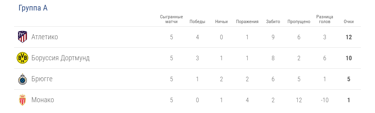 Группа А: «Атлетико», «Боруссия», «Брюгге», «Монако».