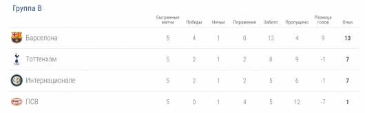 Группа B: «Барселона», «Тоттенхэм», «Интер», ПСВ.