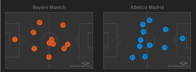 В матче с «Баварией» в Лиге чемпионов, который закончился победой мюнхенцев со счётом 4:0, «Атлетико» сыграл в свой новый футбол. Игроки мадридского клуба вовсе не отсиживались на своей половине поля (смотри усреднённые позиции), да и игра проходила чаще на половине поля мюнхенцев (34% времени). Да, «Атлетико» провёл неудачный матч, но он явно показал, что Диего Симеоне не планирует отходить от атакующей модели игры. Сидеть в обороне мадридцы теперь не будут.