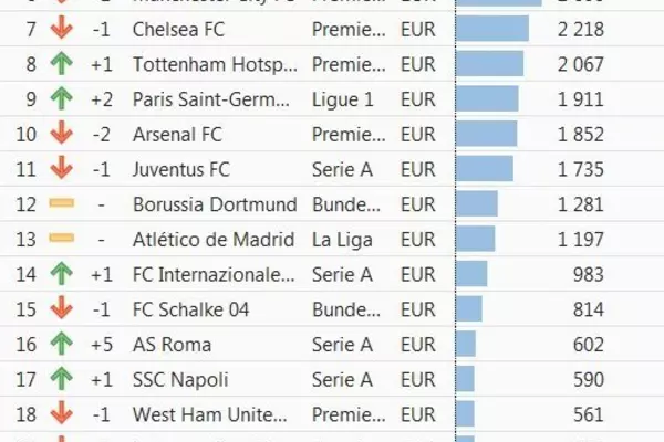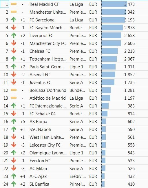 В правом столбике указана стоимость клубов в миллионах евро.