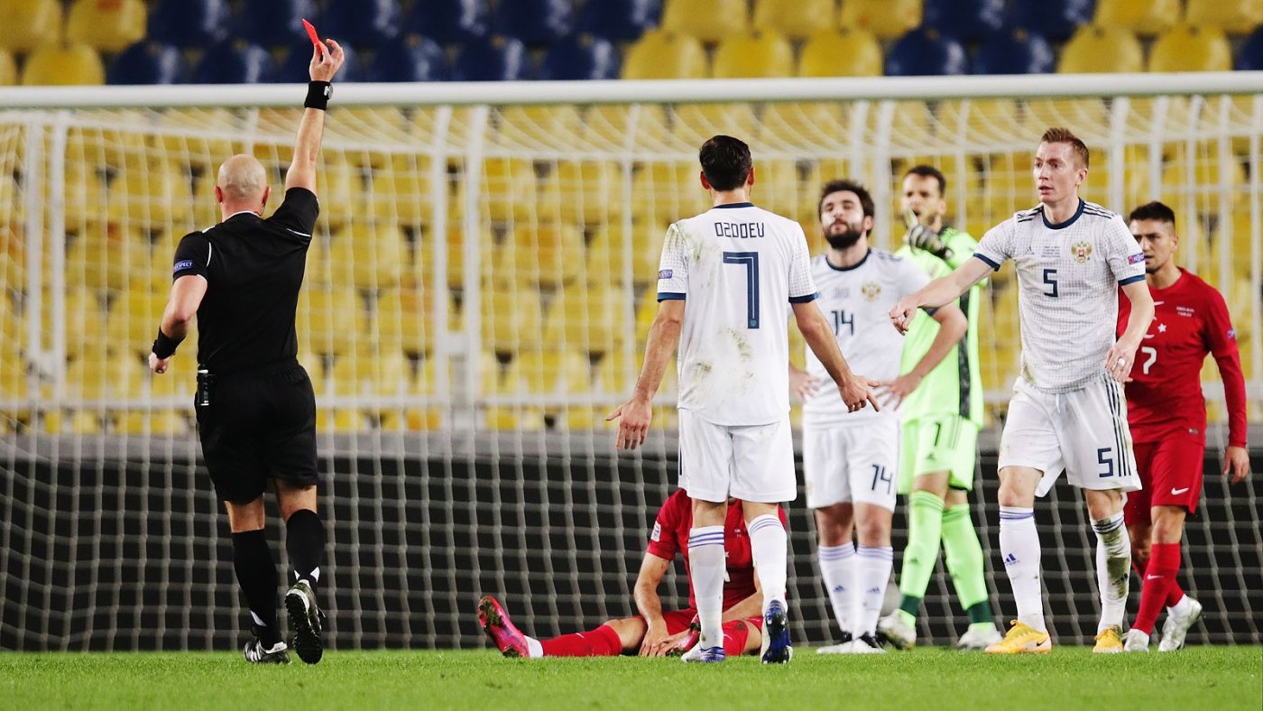 Встреча 5 тура группы 3 Лиги наций между сборными Турции и России состоялась 15 ноября в Стамбуле и закончилась победой хозяев поля со счетом 3:2. Команда Станислава Черчесова активно начала матч, имела игровое преимущество и на 11 минуте забила гол - Денис Черышев замкнул в касание пас от лицевой линии Далера Кузяева. Однако на 23 минуте в игре произошел перелом: польский арбитр матча Шимон Марчиняк удалил с поля защитника Андрея Семенова в эпизоде, возникшем из-за грубой ошибки в середине поля опорного полузащитника Магомеда Оздоева. В течение восьми минут после этого сборная Турции забила 2 гола и вышла вперед. На 52 минуте матча Марчиняк назначил в ворота Маринато Гильерме спорный пенальти в эпизоде, когда Кузяев в подкате сыграл в мяч. 11-метровый был реализован турецким форвардом Тосуном, и со счета 1:3 в меньшинстве сборная России отыграться не смогла, хотя в оставшееся время забила гол (отличился Кузяев) и играла с позиции силы.