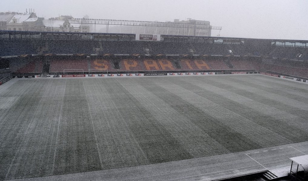 Накануне первого матча 1/16 финала Лиги Европы между "Краснодаром" и "Спартой" поле домашней арены пражан занесло снегом, сообщает пресс-служба чешского клуба.