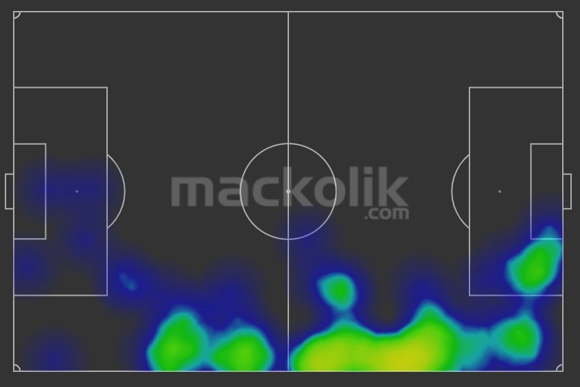 Первый момент – диагональ верхом под рывок Дриусси (не дотянулся, защитник выбил мяч на угловой), второй момент – плотная борьба Дзюбы в штрафной, с последующим кроссом в падении (Мак был не готов замкнуть). Мягко говоря – маловато. «Зенит» даже не доходил до позиций для кроссов с фланга, пруф - тепловая карта ниже.