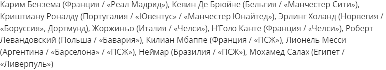 В число претендентов вошли Криштиану Роналду ("Манчестер Юнайтед"), Лионель Месси ("ПСЖ"), Роберт Левандовски ("Бавария") и Эрлинг Холанд ("Боруссия" Д).