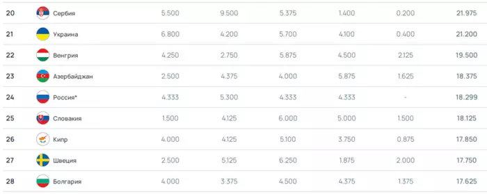 Россия на данный момент имеет 18,299 баллов. На этой неделе 18,375 баллов набрал Азербайджан, который обошёл нашу страну в таблице коэффициентов. В ближайшее время Россию могут обогнать Словакия (у нее 18,125 баллов) и Кипр (у него 17,850 баллов).
