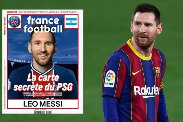 Журнал France Football выпустил номер с коллажным фото нападающего "Барселоны" Лионеля Месси в форме "ПСЖ" на обложке.