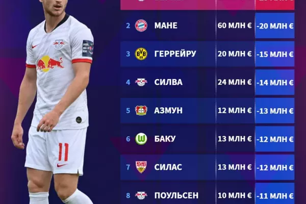 В топ-10 вошли четыре футболиста "Лейпцига": Тимо Вернер, Андре Силва, Юссуф Поульсен и Дани Ольмо.