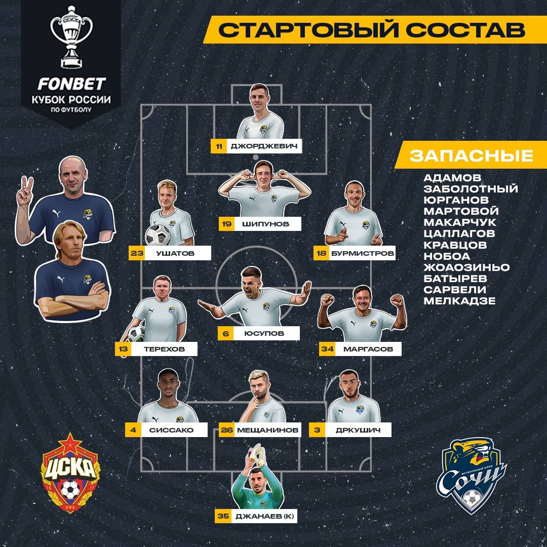 Стали известны составы ЦСКА и "Сочи" на встречу третьего тура групповой стадии Пути РПЛ Кубка России.