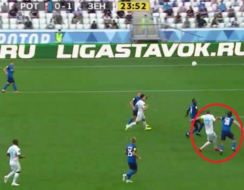 Но ситуация с голом "Зенита" в ворота "Ротора", на которую в перерыве в студии "Матч Премьер" обратили внимание комментаторы Эльвин Керимов и Александр Пойда, проще. Мяч направляется в штрафную, а Дзюба готовится к борьбе за него с Азатом Байрыевым и явно влияет на эпизод.