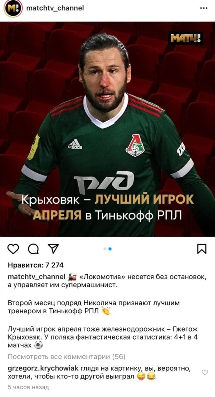 "Глядя на картинку, вы, вероятно, хотели, чтобы кто-то другой выиграл", - оставил такой комментарий Крыховяк под постом "Матч ТВ" в инстаграме.