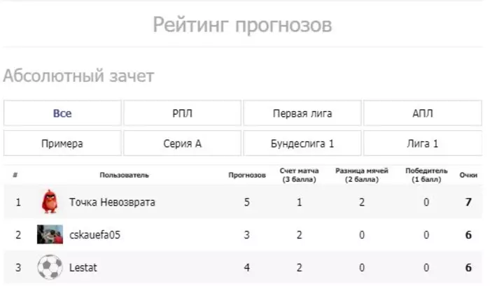 Хотелось бы также отметить, что прогнозы принимаются по всем матчам, а не только по РПЛ (как было ранее, при ручном подсчёте). А также мы сделали отдельные рейтинги по каждому из турниров. И абсолютный зачет. Где суммируются результаты по всем матчам. К слову, сегодня играется ряд матчей Лиги Чемпионов. И ваши прогнозы важны :)