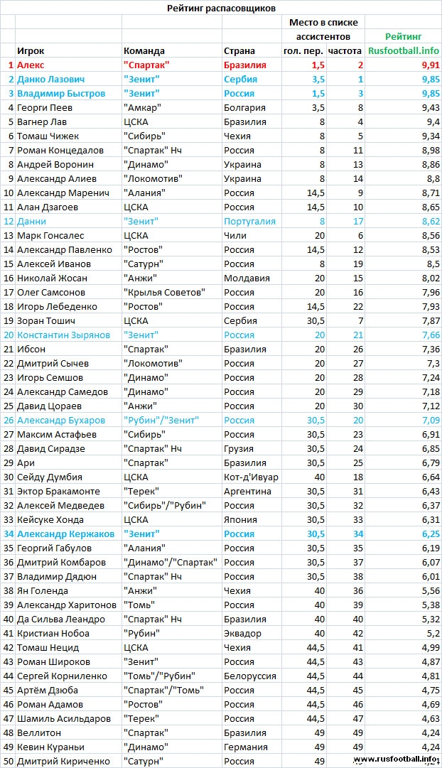 Алекс и Лазович в этом списке поставлены выше Быстрова и Пеева соответственно лишь по той причине, что отдавали голевые передачи чаще, так как провели на поле меньше игрового времени. Радует солидное представительство отечественной футбольной школы: семеро россиян раздали 40 голевых передач, восемь легионеров – 46. Однако имидж Алиева и Воронина плохо вяжется с традиционным представлением о легионерах – почти свои.