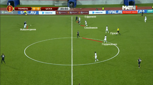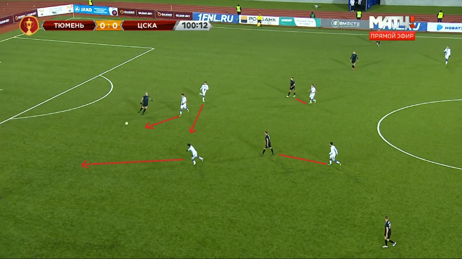 Не менее важно Гончаренко выстраивал переход из атаки в оборону. Благодаря грамотному построению атак ЦСКА был готов к прессингу. «Тюмень» уходила во фланги, к чему московская команда была готова, создавая перевес в количестве. Соперник не мог комбинировать на бровке, поэтому часто играл лонгболами. Вариант пройти через центр практически не было.