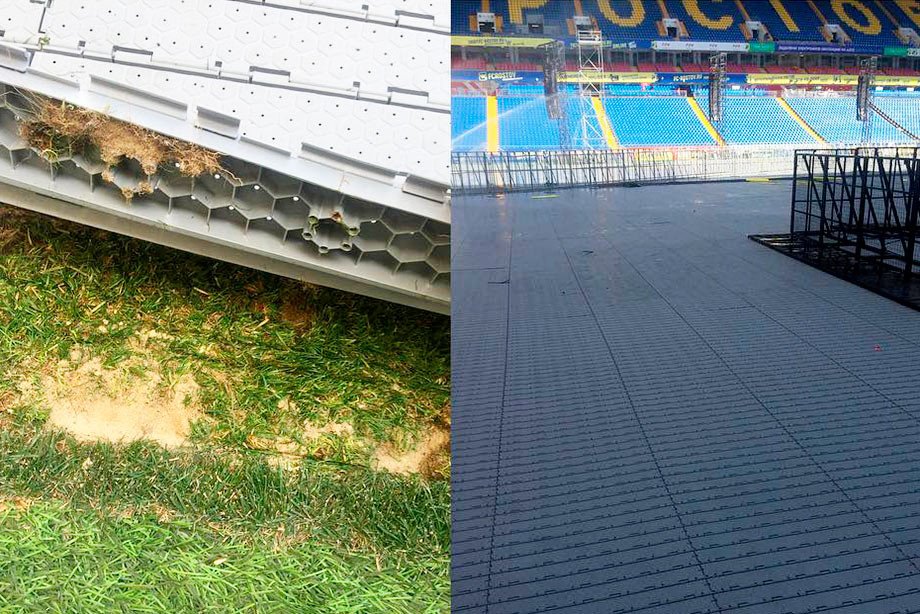 В сети появились фото, якобы газон испорчен, но игра была проведена. Никто сильно не жаловался, а уж на качество футбола покрытие не повлияло точно.