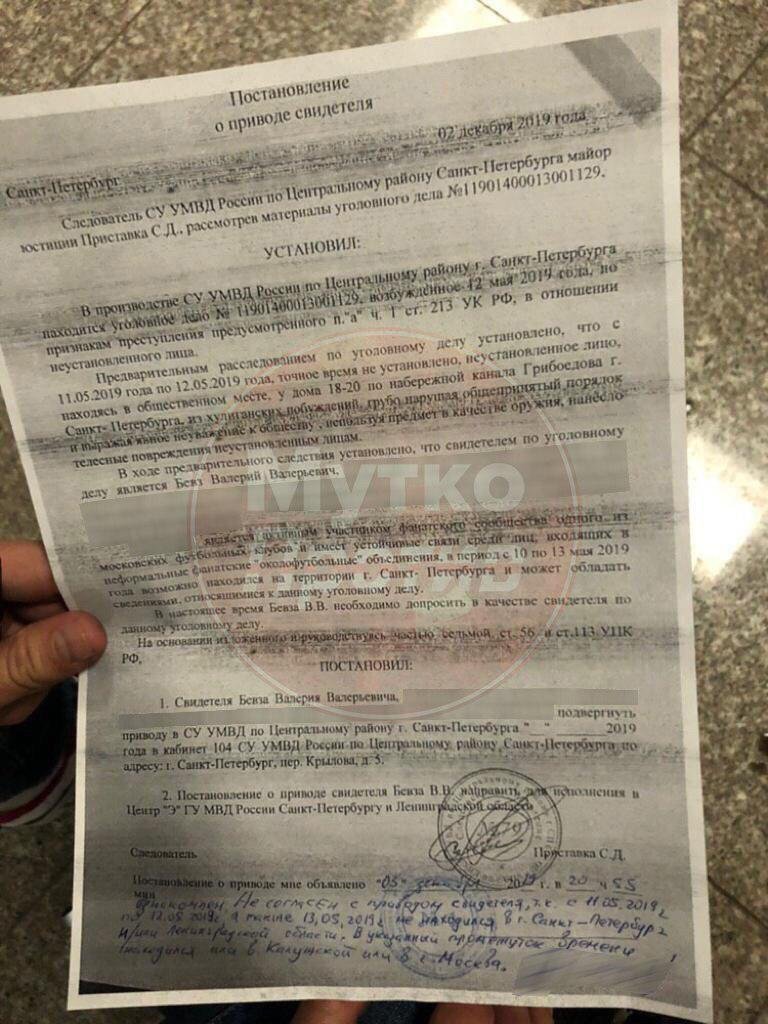 При этом директор фан-клуба утверждает, что заводящему никак невозможно было скрыть своё присутствие в Сан-Марино, если бы он там был. Не присутствовал Валерий и при событиях, из-за которых его увезли из Москвы в Петербург во вторник: его внезапно экстрадировали для допроса по уголовному делу о драке между фанатами, которая произошла 12 мая. В протоколе говорится, что Бевз мог находиться в это время в Санкт-Петербурге, имеет устойчивые связи в нефутбольных объединениях и должен быть подвергнут приводу в отделение.