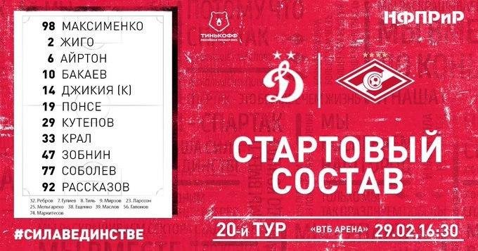 "Динамо" - "Спартак": Соболев дебютирует за красно-белых, Комличенко в запасе 29 февраля 2020 15:21 Стали известны стартовые составы "Динамо" и "Спартака" на матч 20-го тура чемпионата России.Встреча начнется в 16:30 мск."Динамо": Шунин, Паршивлюк, Рыков, Скопинцев, Шунич, Ордец, Шиманьски, Нойштедтер, Хильемарк, Игбун, Нжи."Спартак": Максименко, Кутепов, Джикия, Рассказов, Жиго, Айртон, Зобнин, Бакаев, Крал, Соболев, Понсе. Подписывайтесь на новости футбола от Rusfootball.info в Telegram, Яндекс.Новостях и Гугл.Новостях. Все главные и интересные новости тут Гугл.Новости Яндекс.Новости Телеграм Динамо Спартак