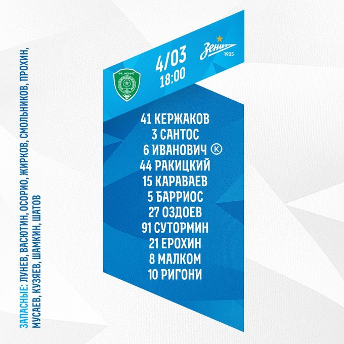 17.18. Исходные данные, то бишь составы, уже известны. Сергей Семак сделал одно изменение в поле - вместо Дриусси вторым нападающим стал Ригони. Хочешь не хочешь, а после такого поверишь в карму - все три нападающих "Зенита" сегодня вне заявки - даже Азмун не сможет, как в матче с "Локо", выйти на замену!