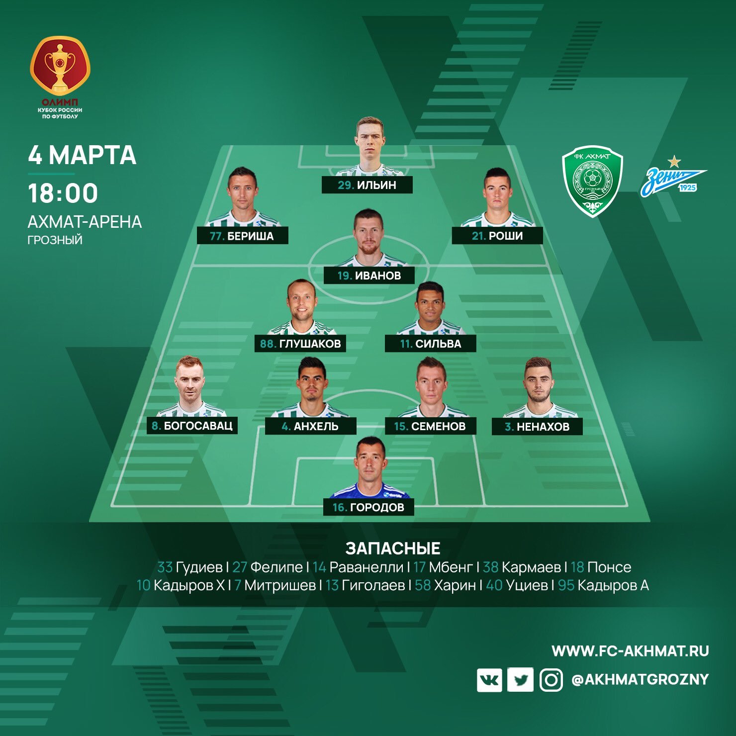 Ахмат: Городов - Богосавац, Анхель, Семёнов, Ненахов - Глушаков (Харин, 82), Исмаэл (Раванелли, 91) - Бериша, Иванов, Роши (Кадыров, 112) - Ильин (Мбенг, 74).