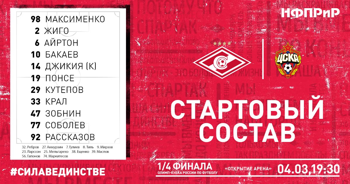 "Спартак": Максименко, Жиго, Кутепов, Джикия, Айртон (Мельгарехо, 119), Рассказов (Ещенко, 90+1), Крал, Зобнин, Бакаев (Тиль, 46), Понсе, Соболев (Ларссон, 74).