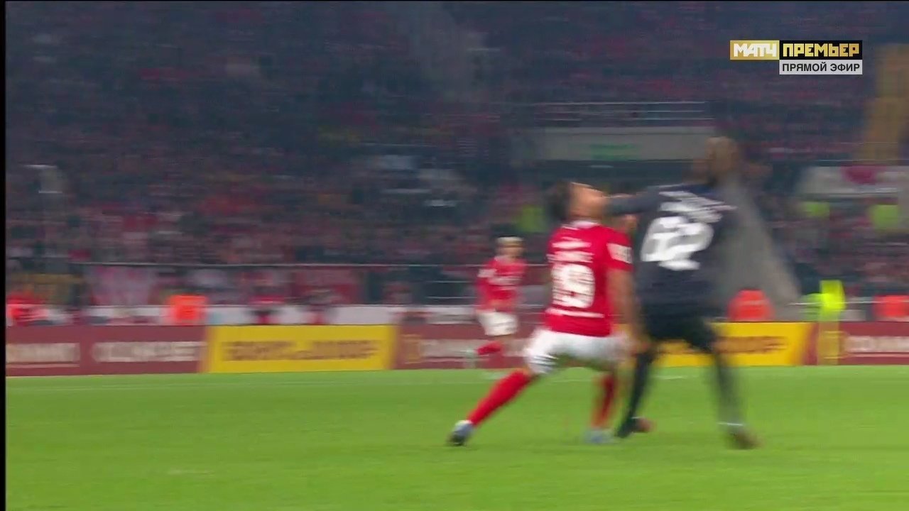 Ещё одна запоминающаяся ошибка – подбив мяча на удар Соболеву. Вадим добирается до мячи, играет головой, но теряет мяч из виду и бежит в сторону от точки его падения.