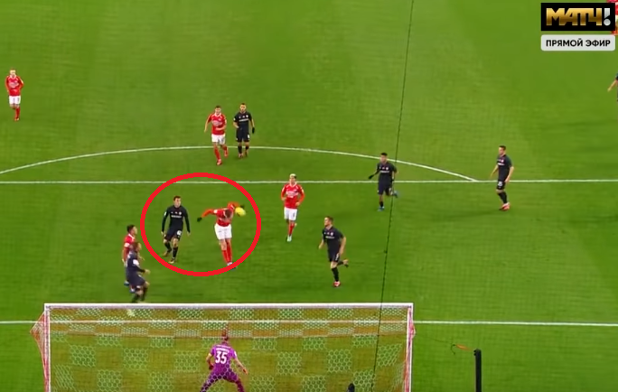 В итоге Соболев без сопротивления опасно бьёт – везёт, что игра головой не является сильной стороной огромного форварда, в этом сезоне он забивает только ногами.