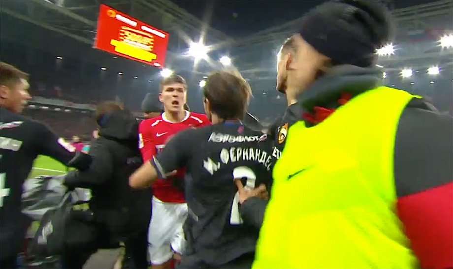 Ставить обнаглевшего юношу идёт Ещенко, но партнёры уводят Карпова. Затем в дело вступает Ребров и толкает обнаглевшего – тут начинается потасовка с участием Марио Фернандеса, Соболева и остальных. Марио заступается за партнёра: в интервью он отмечает, что нельзя было соперникам дать запугать парня.