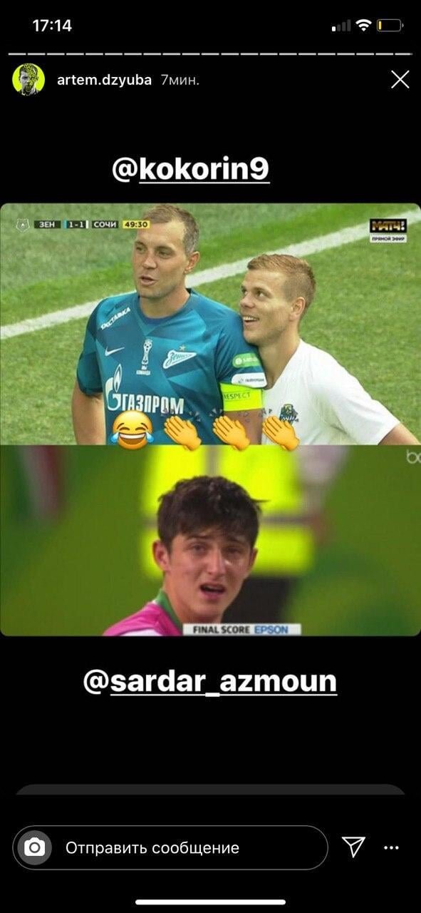 Капитан сборной России Артем Дзюба продолжает шутить над своими отношениями с Сердаром Азмуном. Он опубликовал коллаж, где иранец расстроен тому, что рядом с Артемом стоит довольный Александр Кокорин.