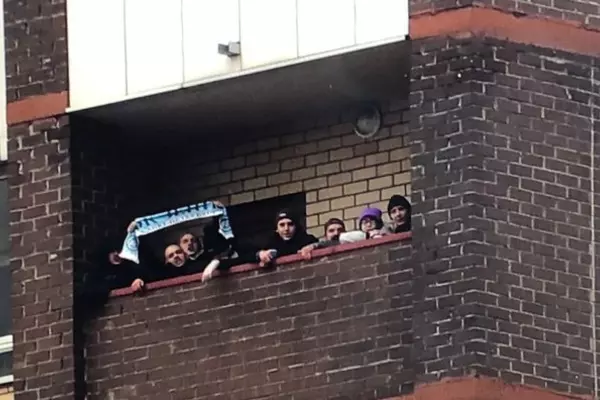 Фанаты "Зенита" поддерживают команду в Химках с балконов домов