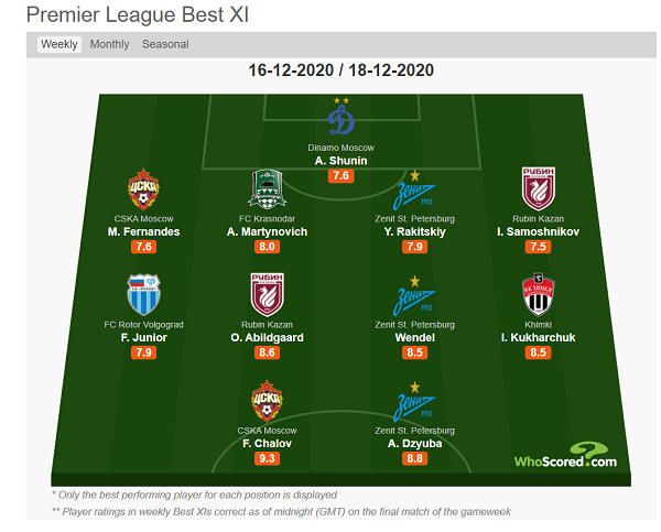 Портал WhoScored составил символическую сборную лучших игроков 19-го тура РПЛ.