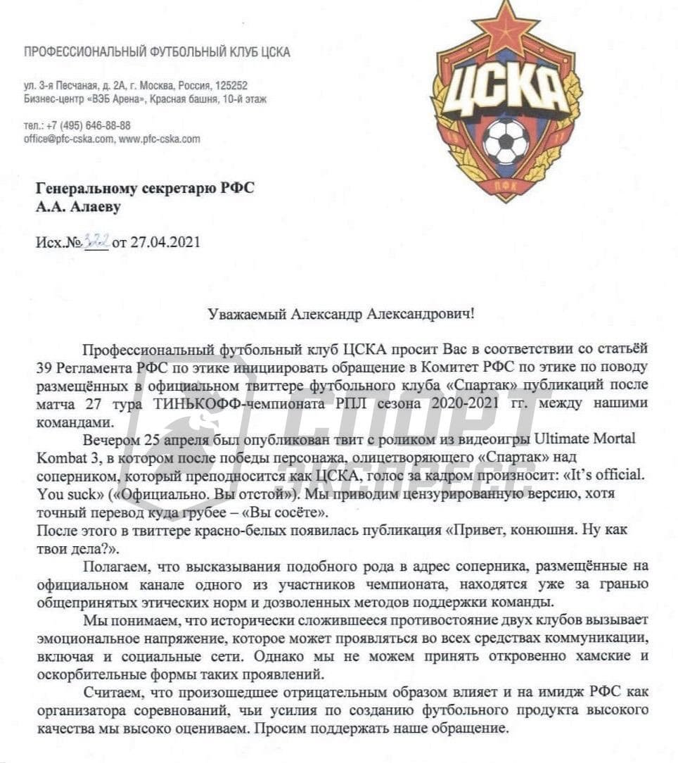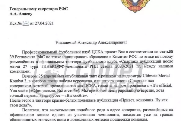 Руководство ЦСКА направило письмо в Российский футбольный союз с просьбой дать оценку публикациям "Спартака" в клубном Twitter после матча 27-го тура Российской Премьер-Лиги.