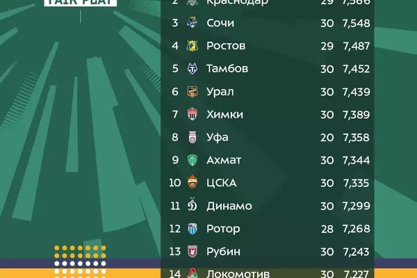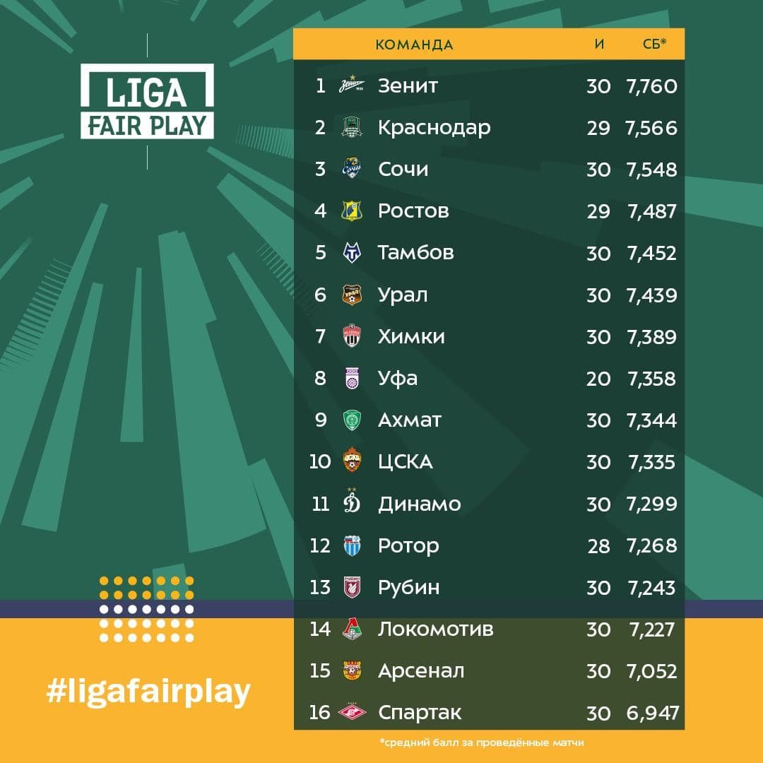 Второе место занял "Краснодар", а тройку лучших замкнул "Сочи". Худший средний балл показал московский "Спартак".
