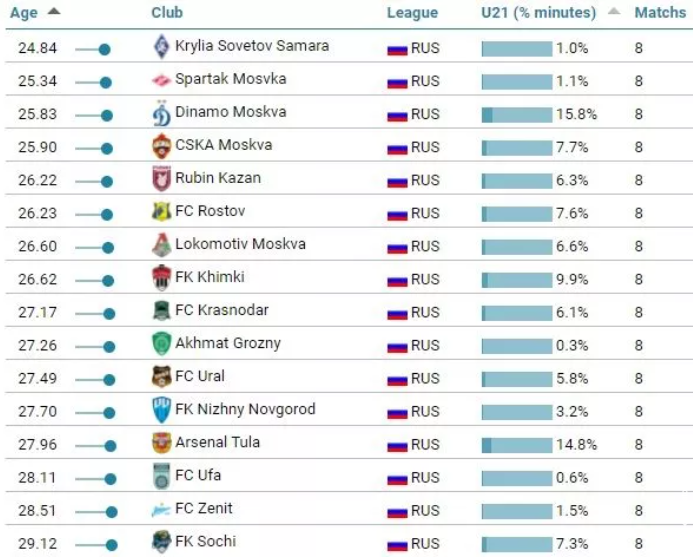Исследовательский центр CIES Football Observatory опубликовал рейтинг команд РПЛ по среднему возрасту состава в текущем сезоне, опираясь на игровое время футболистов в первых 8 турах чемпионата России. Также в этом рейтинге показан процент участия в игре каждого клуба футболистов в возрасте до 21 года.