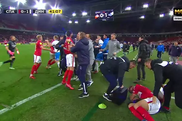 Футболисты "Спартака" и "Динамо" устроили массовую потасовку в конце первого тайма (видео)