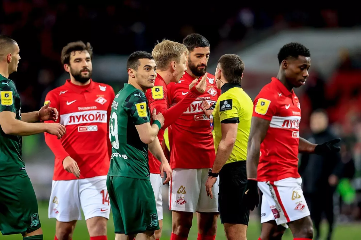 Напомним, "Спартак" дома уступил "Краснодару" со счетом 1:2. Уже на пятой минуте встречи арбитр Евгений Кукуляк назначил опасный штрафной в ворота москвичей за попадание мяча в руку Кофрие. Сперцян ударом со штрафного открыл счет. Уже в ходе первого тайма красно-белые отыгрались, но судьи отменили гол после просмотра видеоповтора, заметив у Николсона, отдавшего голевую передачу, офсайд. После этого "Спартак" смог отыграться с пенальти, назначенного за игру рукой Ильина в своей штрафной.