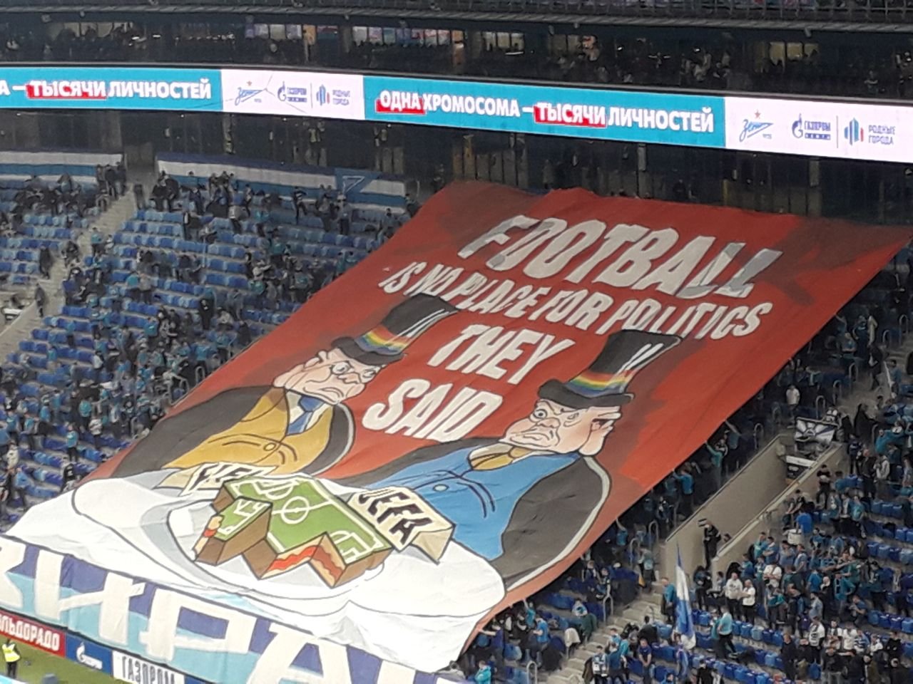 "Футбол вне политики, говорили они" - написано на полотне. Также болельщики питерцев скандировали: "Футбол для фанатов, а не для УЕФА".