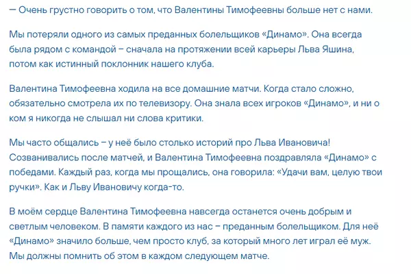 Шунин — о вдове Яшина: для нее "Динамо" значило больше, чем просто клуб, за который много лет играл её муж
