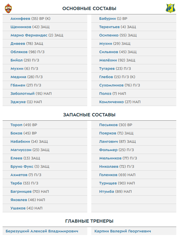 В основе "армейцев" выйдут защитник Марио Фернандес и опорный полузащитник Жан-Филипп Гбамен, коорый покинут команду по окончании сезона. Как сообщил официальный телеграм-канал красно-синих, Фернандес выйдет на поле с капитанской повязкой. Место в воротах "Ростова" занял запасной голкипер Егор Бабурин.