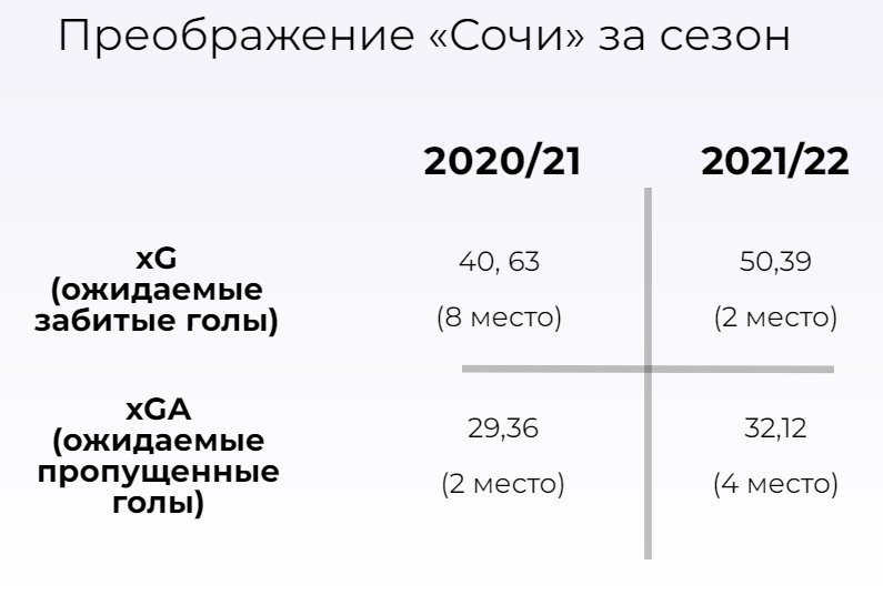 В итоге "Сочи" крайне ровно провел второй сезон в РПЛ. Федотов выстроил практически самую крепкую оборону в лиге (второе место после "Зенита" по ожидаемым пропущенным), позволившую сочинцам зацепиться за четвертое место и пробиться в еврокубки.