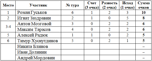 В зачете журналистов дававший прогноз на матчи 6 тура Роман Гуськов набрал 10 очков, что стало лучшим результатом с начала конкурса, опередил всех своих коллег и вышел на первое место. Роман точно предсказал счет во встрече "Крылья Советов" - "Факел" (1:1), разницу в матчах "Ростов" - "Сочи" (2:2) и ЦСКА - "Ахмат" (4:2), а также победы "Локомотива", "Зенита" и "Краснодара". Игнат Заздравин с 8 очками переместился на вторую строчку, третью позицию делят между собой Антон Мозговой и Максим Тарасов, на счету которых по 6 очков.