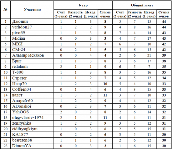 В конкурсе читателей творится что-то невероятное: выдавший рекордный показатель в прошлом туре (14 очков!) лидер турнирной таблицы Midian на этот раз оступился, собрав только 3 балла, притормозил и шедший вторым СМ-24 - в результате первенство захватили Джонни и verhdon27, которые набрали в общем зачете по 44 очка. По сути, можно говорить о группе лидеров из 6 человек, располагающихся в пределах двух очков друг от друга; кроме вышеперечисленных, в нее входят также МВИ и pivo69, который вышел на текущее третье место. Совсем рядом с этой группой находятся Альмир Искаков и Бриг, которые уже в следующем туре также могут вмешаться в распределение призовых мест. Лучшим же в 6 туре стал новый участник нашего конкурса Больной, который показал вполне здоровый результат - 12 очков; он верно предсказал сразу 3 точных счета - в матчах "Крылья Советов" - "Факел" (1:1), "Химки" - "Локомотив" (0:3) и "Ростов" - "Сочи" (2:2), а также разницу в игре ЦСКА - "Ахмат" и победу "Зенита" над "Торпедо" - в этом матче взяли как минимум 1 очко практически все участники конкурса.