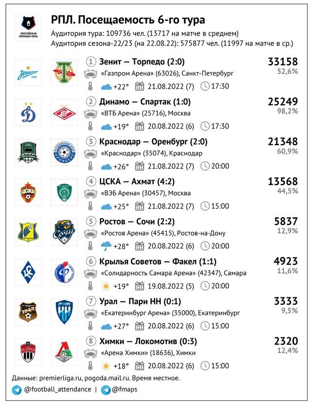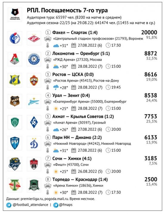 На «Фиште» новый антирекорд сезона – 3 185 человек с «Химками», ранее было 3 772 с «Ахматом» и 3 334 с «Пари НН». В Нижнем Новгороде на «Динамо» (6 133) пришло больше народу, чем на «Ростов» (5 784), но, разумеется, меньше, чем на ЦСКА за символическую плату (11 847); по всей вероятности, посещаемость с «армейцами» при полной оплате тоже была бы в районе шести-семи тысяч. «Урал» почти дотянулся до своего рекорда сезона со «Спартаком», когда на матче был 8 931 болельщик, а «Ростов» в полтора раза перекрыл свой лучший показатель из 6 тура – 8 616 человек после 5 837!