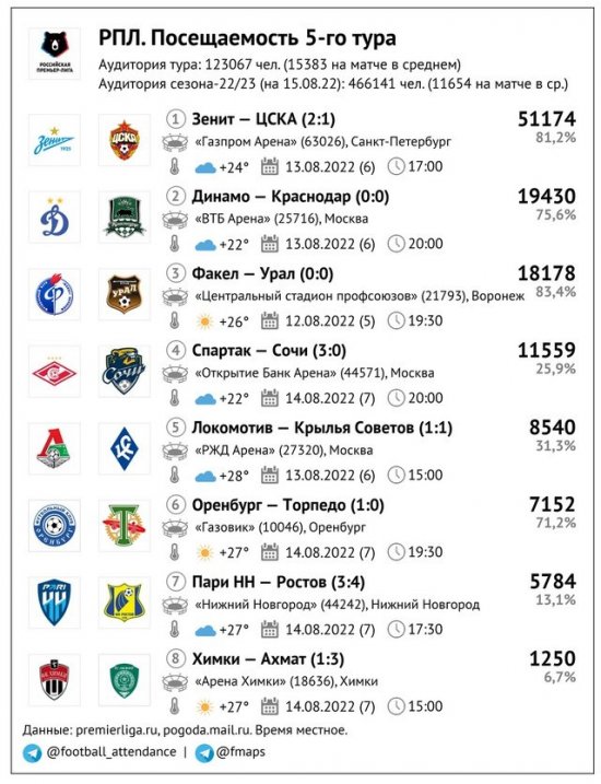 Другой показательный момент: то, что в туре был всего 1 матч с Fan ID, сразу резко подняло его среднюю посещаемость! И это даже несмотря на то, что играли дома традиционный аутсайдер по этому показателю «Химки» и «Оренбург» с самым маленьким в лиге стадионом – это успешно нивелировалось топ-матчем на самой большой арене в Петербурге. В среднем на одном матче 5 тура присутствовало 15 383 зрителя – это новый рекорд сезона, и почти на 3 тысячи(!) больше прежнего рекорда (12 477), установленного в 3 туре. Игра с Fan ID же стала предпоследней по посещаемости – хуже было только в Химках.