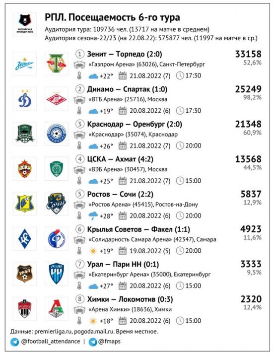 В таблице общей посещаемости 6 тура все три матча Fan ID ожидаемо в нижней части – меньше зрителей было только на злосчастной «Арене Химки». Средняя тоже логично просела по сравнению с рекордным 5 туром – 13 713 болельщиков в среднем на матч.