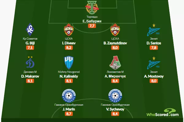 Защита ЦСКА, атака "Оренбурга", левый фланг "Зенита" и голкипер "Торпедо" - в сборной лучших 8 тура РПЛ от Whoscored