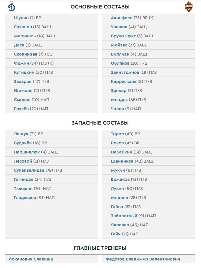 Перед началом встречи ЦСКА занимает четвертое место в турнирной таблице РПЛ. Команда Владимира Федотова уже не сможет подняться выше по итогам тура, но может уступить место в топ-4 как раз "Динамо" - бело-голубые отстают от сегодняшнего соперника на 3 очка и идут шестыми.