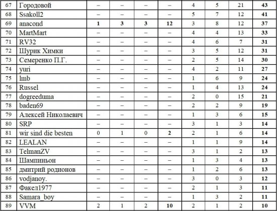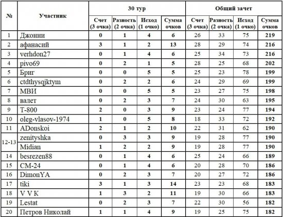 Лучшими прогнозистами 30 тура стали tiki, который повторил рекордный показатель 14 очков, и афанасий с 13 очками. А турнирная таблица приняла в итоге такой вид: