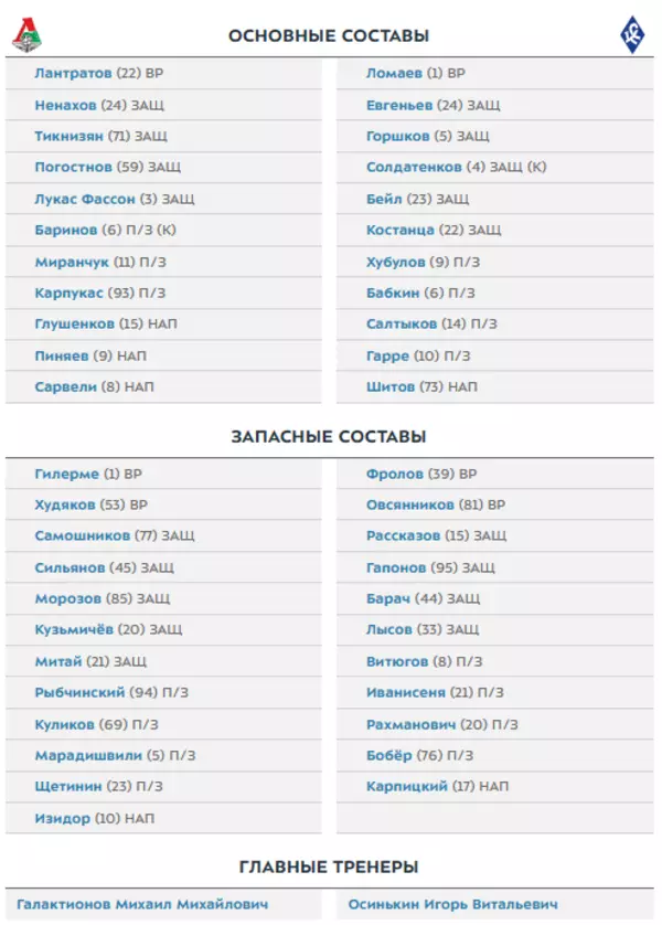 Официальный сайт Российской премьер-лиги опубликовал полные заявки команд на игру 4 тура национального первенства между московским "Локомотивом" и самарскими "Крыльями Советов".
