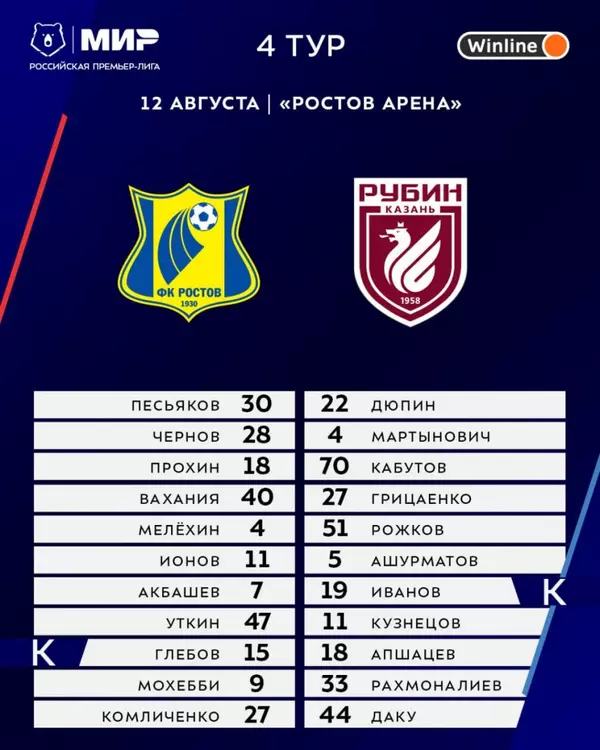 12 августа "Ростов" проведет домашний матч против "Рубина" в рамках четвертого тура Российской Премьер-лиги. Стартовый свисток встречи запланирован на 20:30 по московскому времени. Южане и казанцы уже объявили стартовые составы на очную битву, которую обслужит рефери Алексей Сухой.