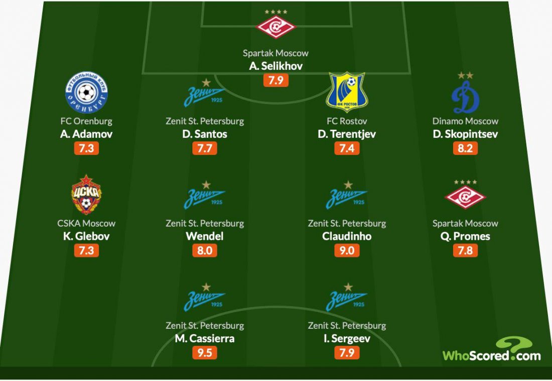 Селихов, Скопинцев, Терентьев и 5 игроков "Зенита" - в сборной 6 тура РПЛ по версии Whoscored
